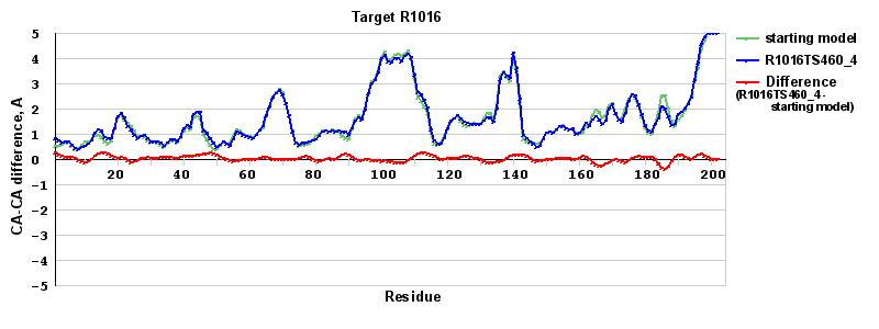 | Red line = (blue line) - (green thick line): difference between the corresponding Refined Model-Target and Starting Model-Target CA-CA distances (see above). Negative values show regions where the reifned model has better fit to the target than the starting model, i.e. areas of potential improvement. |