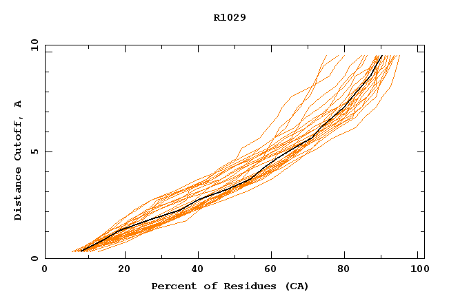GDT analysis: largest set of CA atoms (percent of the modeled structure) that can fit under DISTANCE cutoff: 0.5A, 1.0A, 1.5A, ... , 10.0A