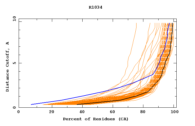 GDT analysis: largest set of CA atoms (percent of the modeled structure) that can fit under DISTANCE cutoff: 0.5A, 1.0A, 1.5A, ... , 10.0A