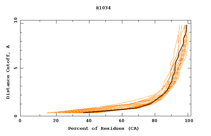 GDT analysis: largest set of CA atoms (percent of the modeled structure) that can fit under DISTANCE cutoff: 0.5A, 1.0A, 1.5A, ... , 10.0A