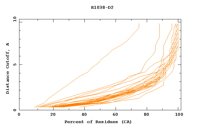 GDT analysis: largest set of CA atoms (percent of the modeled structure) that can fit under DISTANCE cutoff: 0.5A, 1.0A, 1.5A, ... , 10.0A