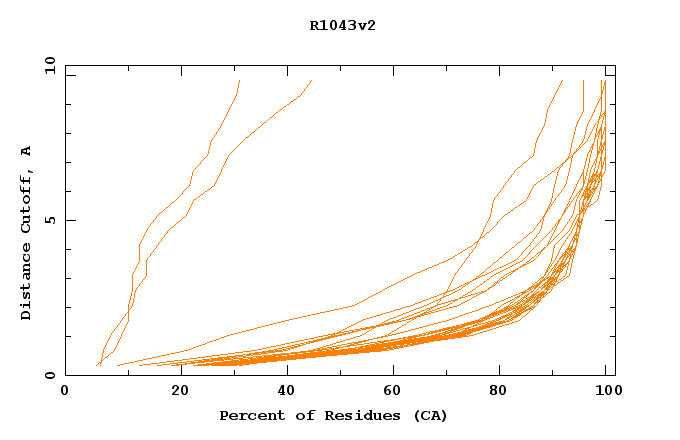 GDT analysis: largest set of CA atoms (percent of the modeled structure) that can fit under DISTANCE cutoff: 0.5A, 1.0A, 1.5A, ... , 10.0A