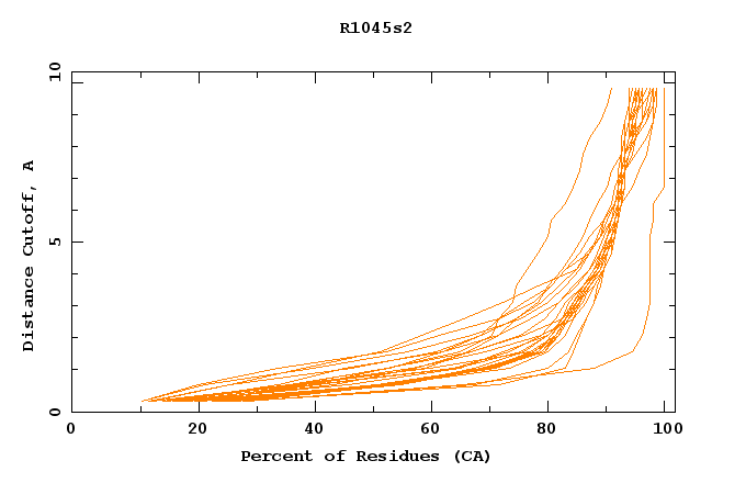 GDT analysis: largest set of CA atoms (percent of the modeled structure) that can fit under DISTANCE cutoff: 0.5A, 1.0A, 1.5A, ... , 10.0A