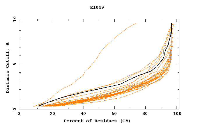 GDT analysis: largest set of CA atoms (percent of the modeled structure) that can fit under DISTANCE cutoff: 0.5A, 1.0A, 1.5A, ... , 10.0A