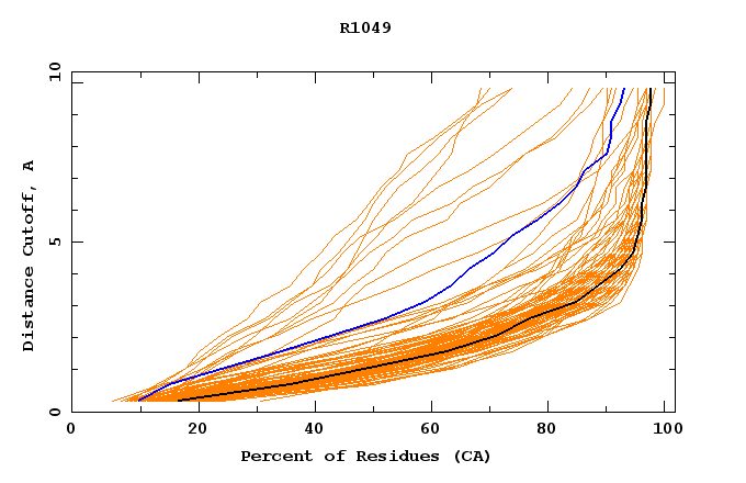 GDT analysis: largest set of CA atoms (percent of the modeled structure) that can fit under DISTANCE cutoff: 0.5A, 1.0A, 1.5A, ... , 10.0A