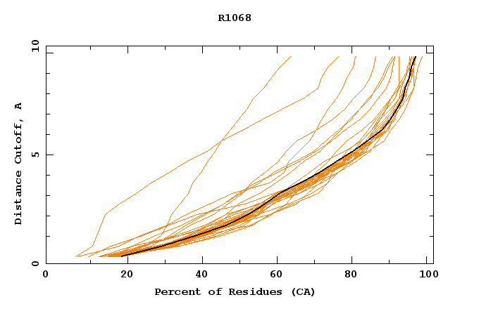GDT analysis: largest set of CA atoms (percent of the modeled structure) that can fit under DISTANCE cutoff: 0.5A, 1.0A, 1.5A, ... , 10.0A