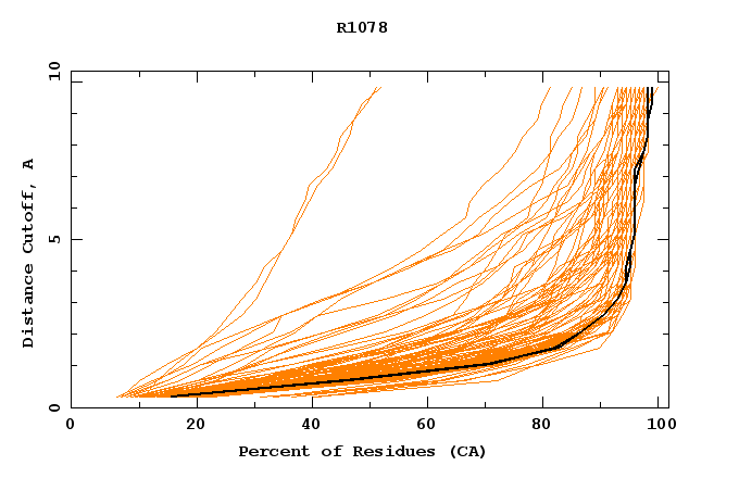 GDT analysis: largest set of CA atoms (percent of the modeled structure) that can fit under DISTANCE cutoff: 0.5A, 1.0A, 1.5A, ... , 10.0A