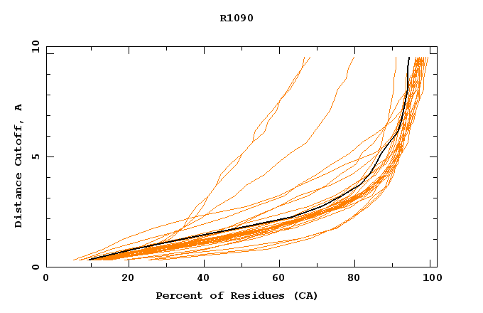 GDT analysis: largest set of CA atoms (percent of the modeled structure) that can fit under DISTANCE cutoff: 0.5A, 1.0A, 1.5A, ... , 10.0A