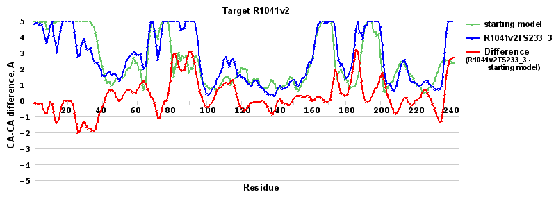 | Red line = (blue line) - (green thick line): difference between the corresponding Refined Model-Target and Starting Model-Target CA-CA distances (see above). Negative values show regions where the reifned model has better fit to the target than the starting model, i.e. areas of potential improvement. |