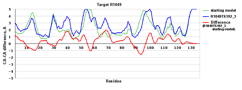 | Red line = (blue line) - (green thick line): difference between the corresponding Refined Model-Target and Starting Model-Target CA-CA distances (see above). Negative values show regions where the reifned model has better fit to the target than the starting model, i.e. areas of potential improvement. |
