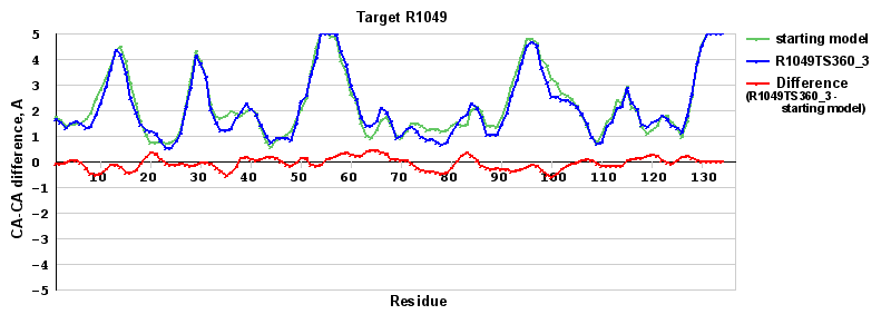 | Red line = (blue line) - (green thick line): difference between the corresponding Refined Model-Target and Starting Model-Target CA-CA distances (see above). Negative values show regions where the reifned model has better fit to the target than the starting model, i.e. areas of potential improvement. |