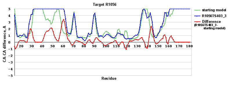 | Red line = (blue line) - (green thick line): difference between the corresponding Refined Model-Target and Starting Model-Target CA-CA distances (see above). Negative values show regions where the reifned model has better fit to the target than the starting model, i.e. areas of potential improvement. |