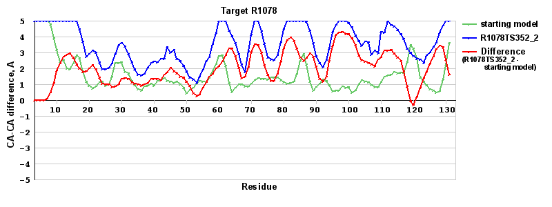 | Green line: distance between the aligned CA atoms in the starting model and the experimental structure in the LGA sequence-independent superposition under the 4A distance cutoff (see LGA description). |