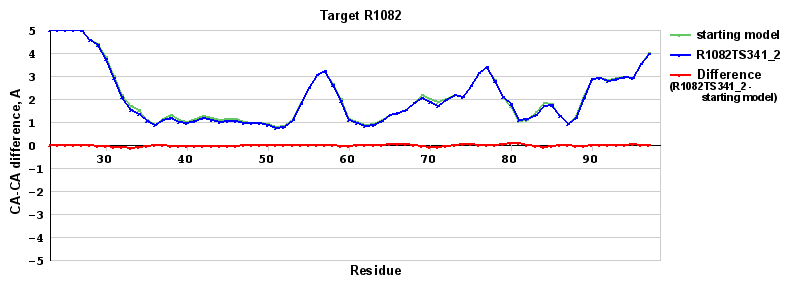 | Red line = (blue line) - (green thick line): difference between the corresponding Refined Model-Target and Starting Model-Target CA-CA distances (see above). Negative values show regions where the reifned model has better fit to the target than the starting model, i.e. areas of potential improvement. |